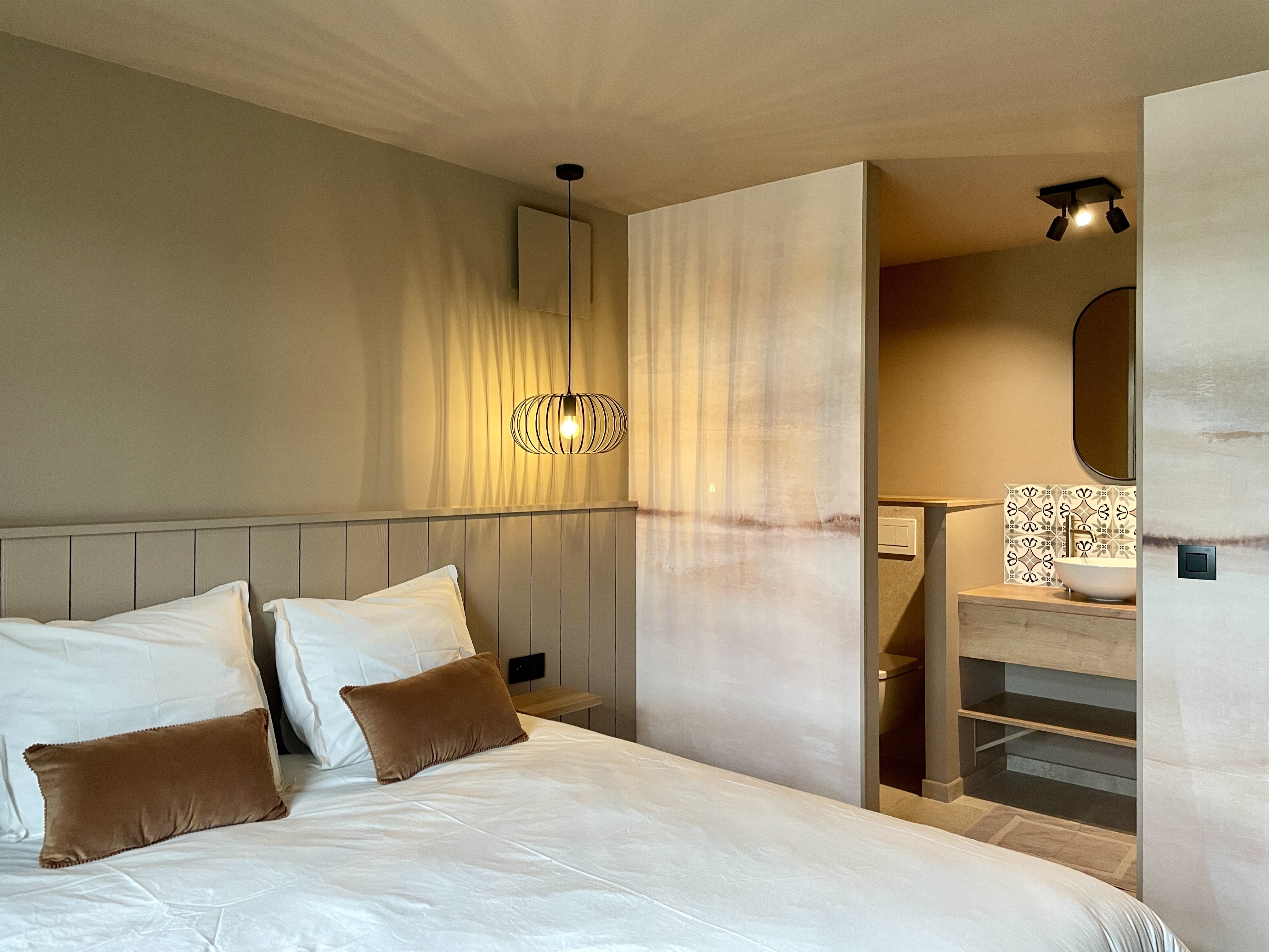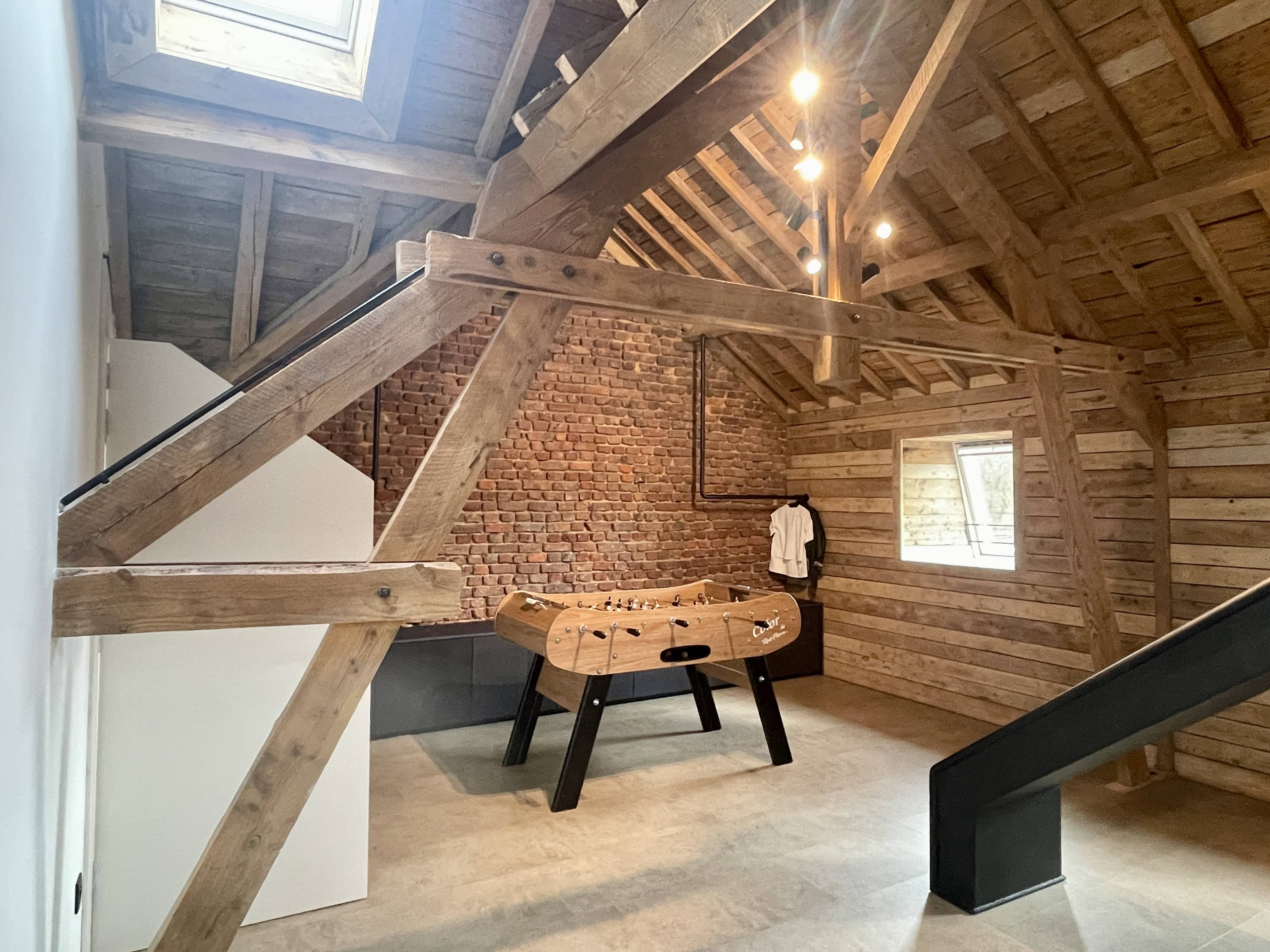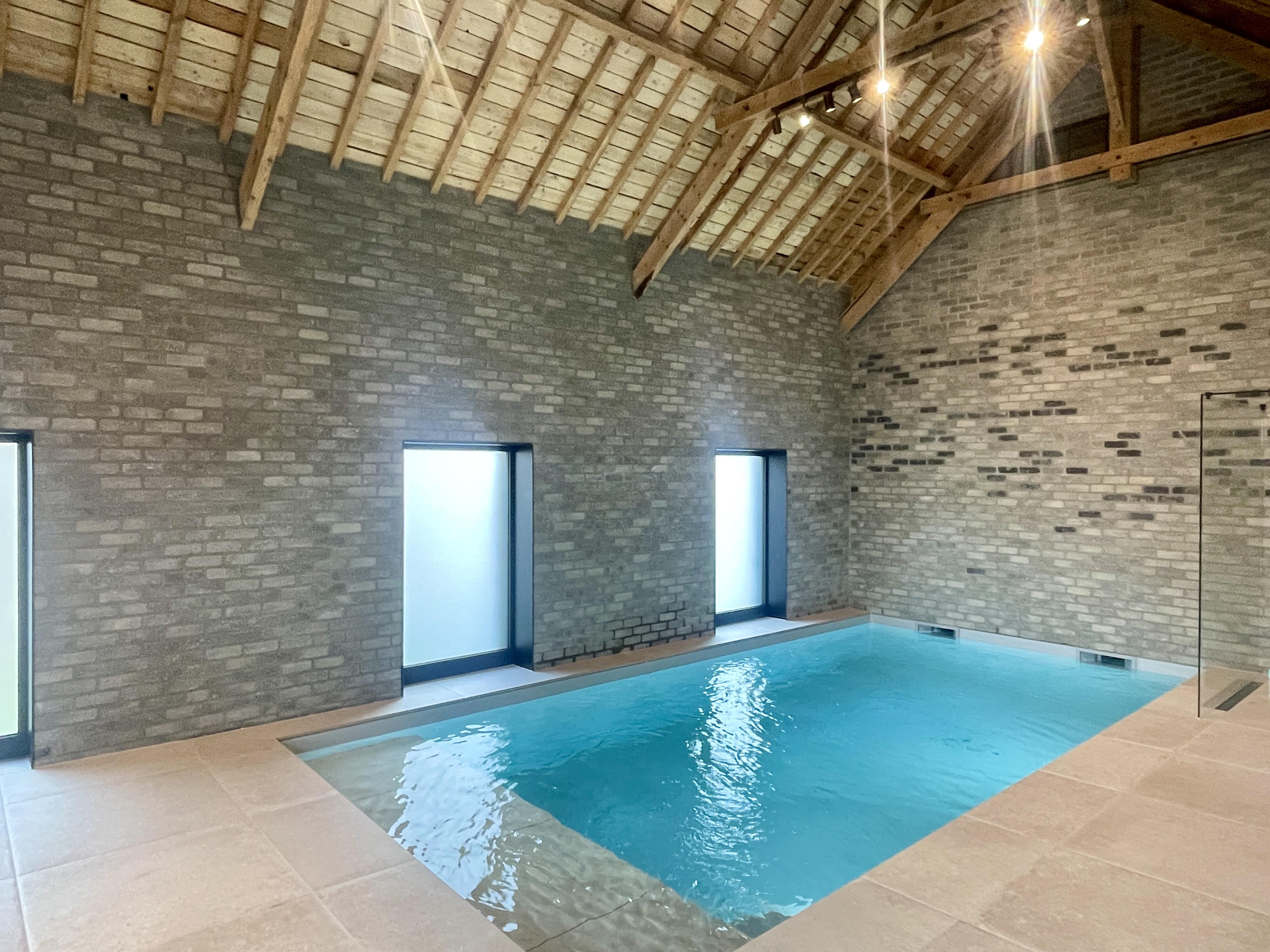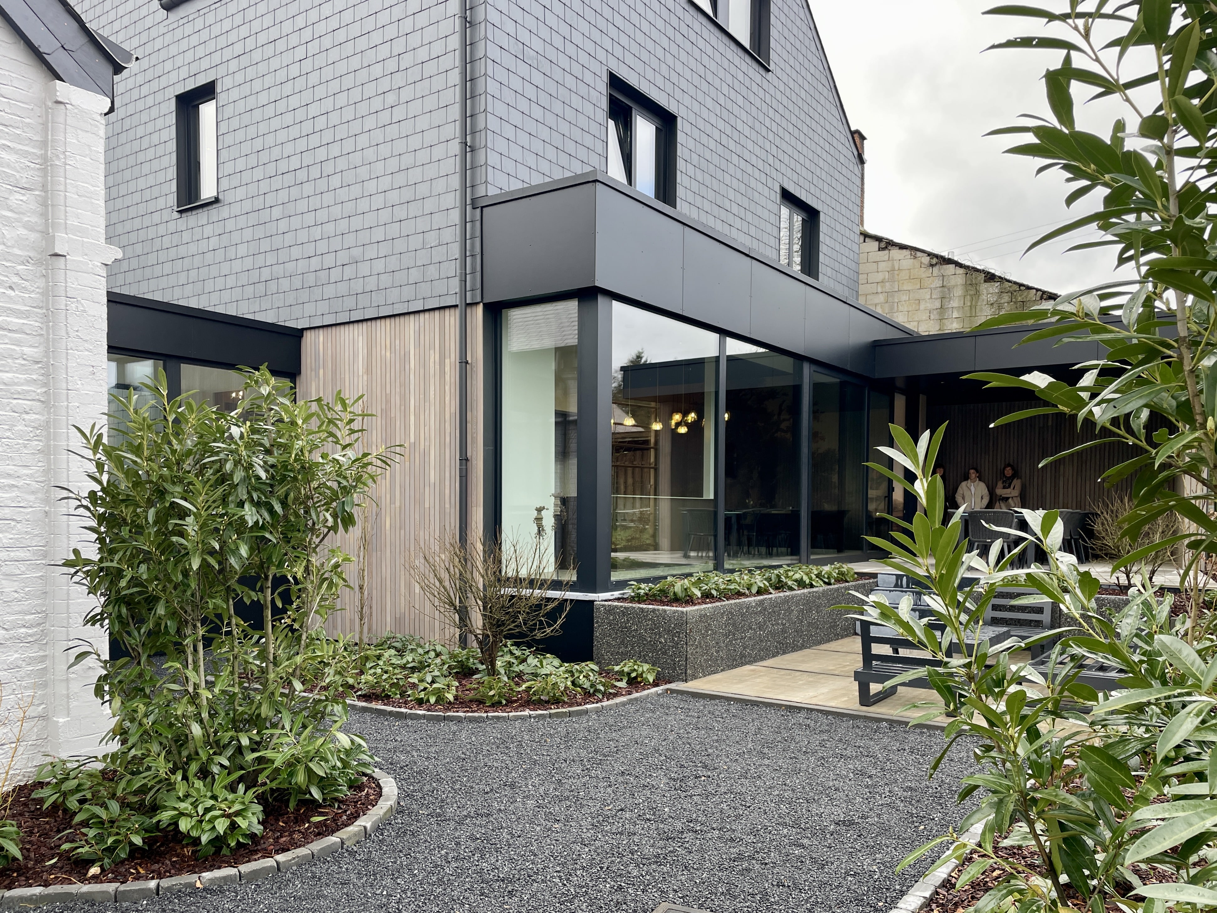 Transformation d’une habitation en gîte (14 pers.) avec création d’une zone bien-être et piscine dans le volume annexe existant. Transformations, principalement intérieures de l’existant, dont les volumes ne changent pas. Nouveau volume de liaison avec toit plat pour un ensoleillement maximum du jardin situé au nord. Mise en valeur des façades principales en brique et utilisation du bardage ardoisé pour les autres façades. Travail du panneau Trespa pour l’habillage des tranches de toiture et utilisation du bardage bois pour l’habillage intérieur des terrasses.