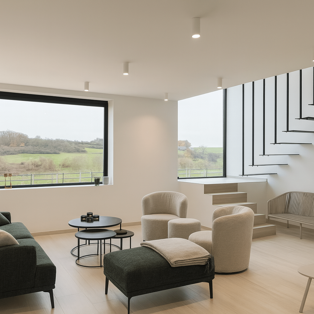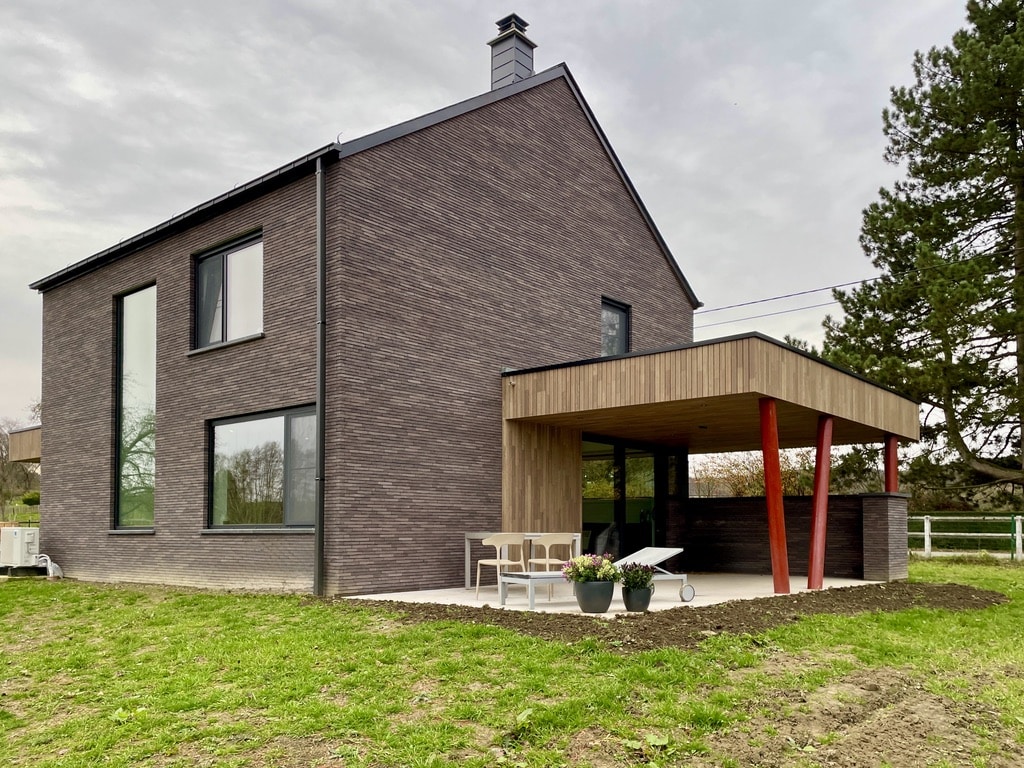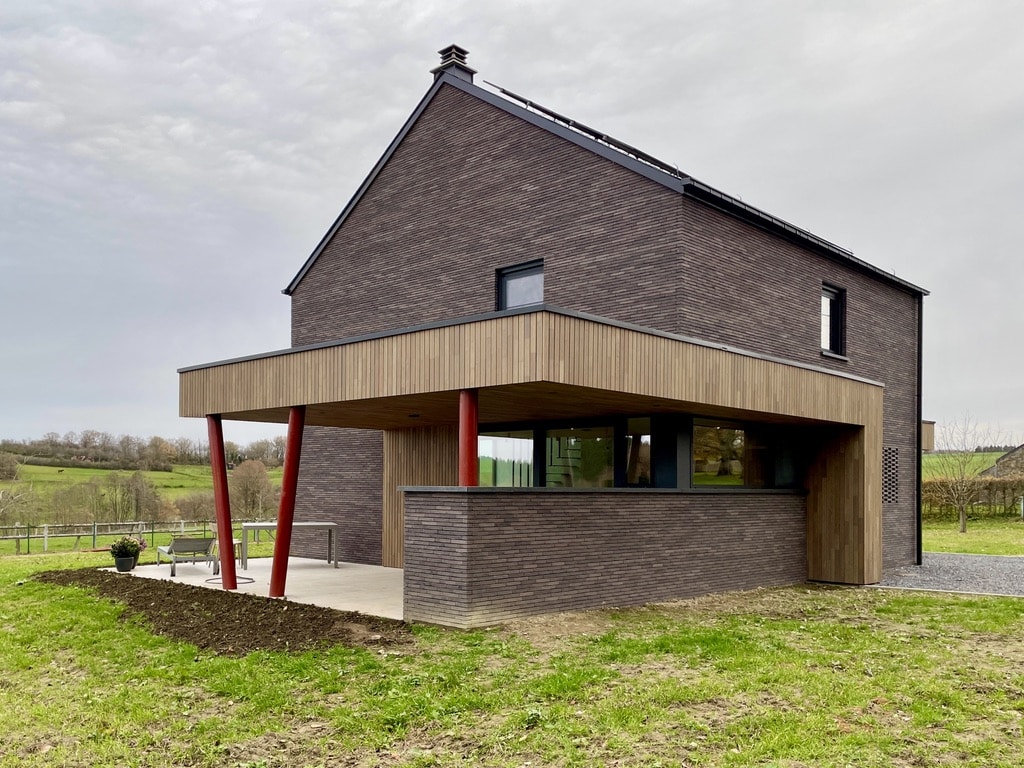 Situé à la sortie du village de Awenne, le choix des matériaux est ici respectueux, par ces teintes sobres, d’un contexte principalement champêtre et légèrement boisé. Le projet, par la