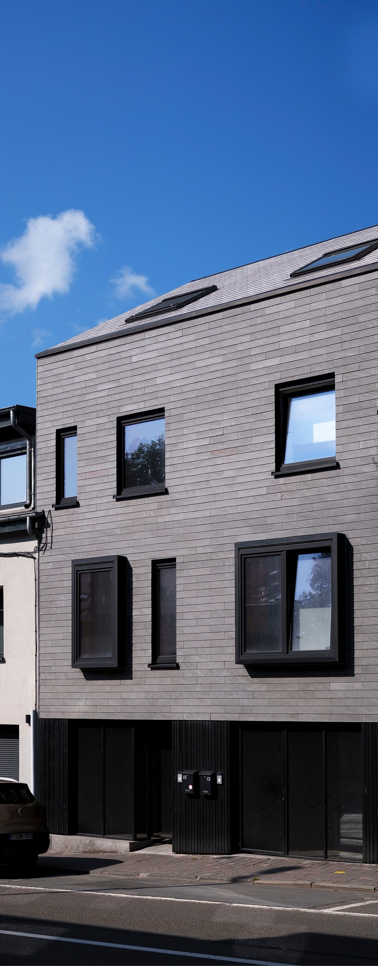 Transformation de deux anciennes habitations laissées à l’abandon en quatre logements verticaux. L’accès aux bâtiments par deux rues distinctes permet de créer une séparation nette entre les quatre entités. Les façades sont recouvertes d’un bardage ardoisé type ETERNIT gris béton.