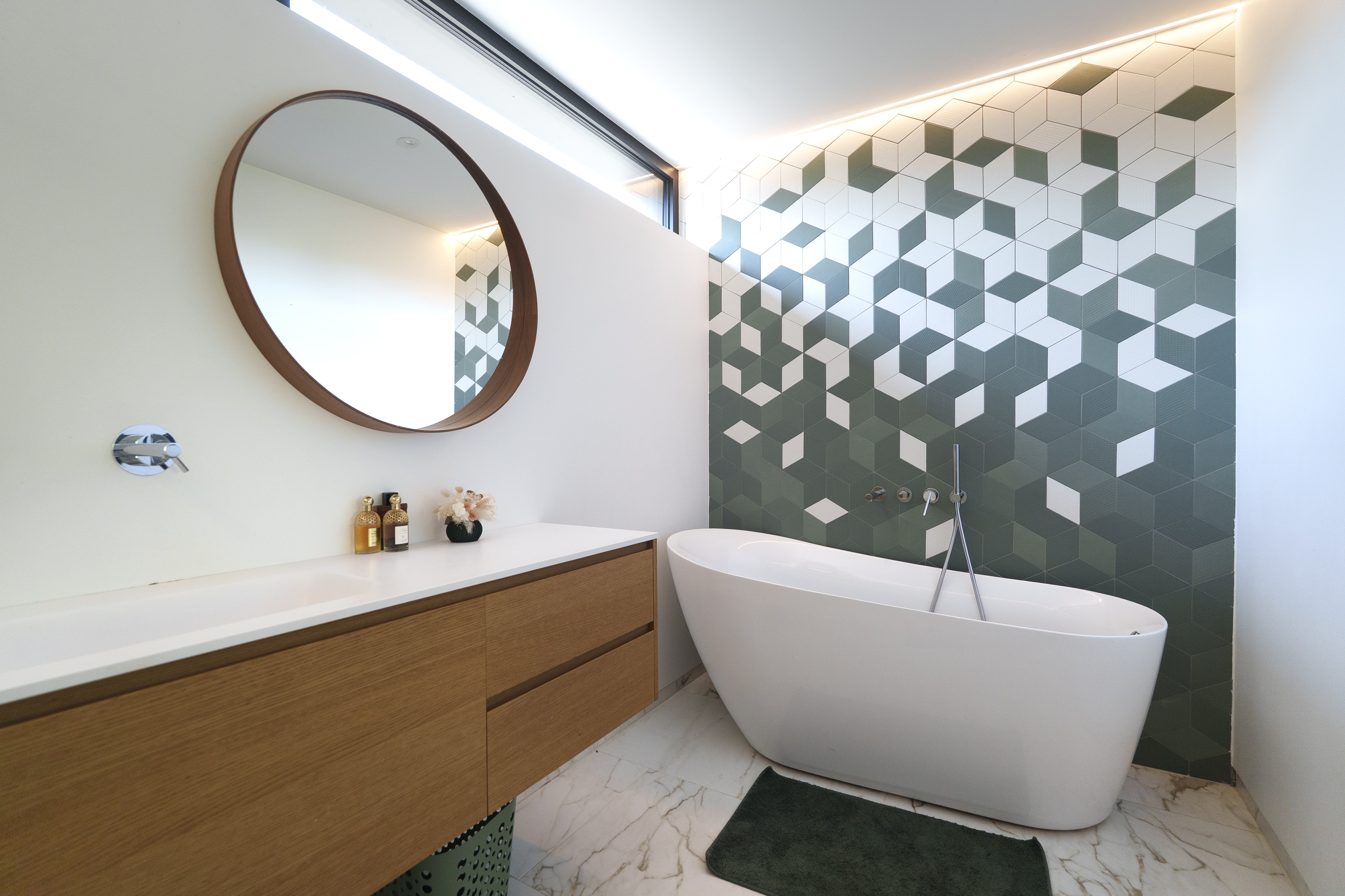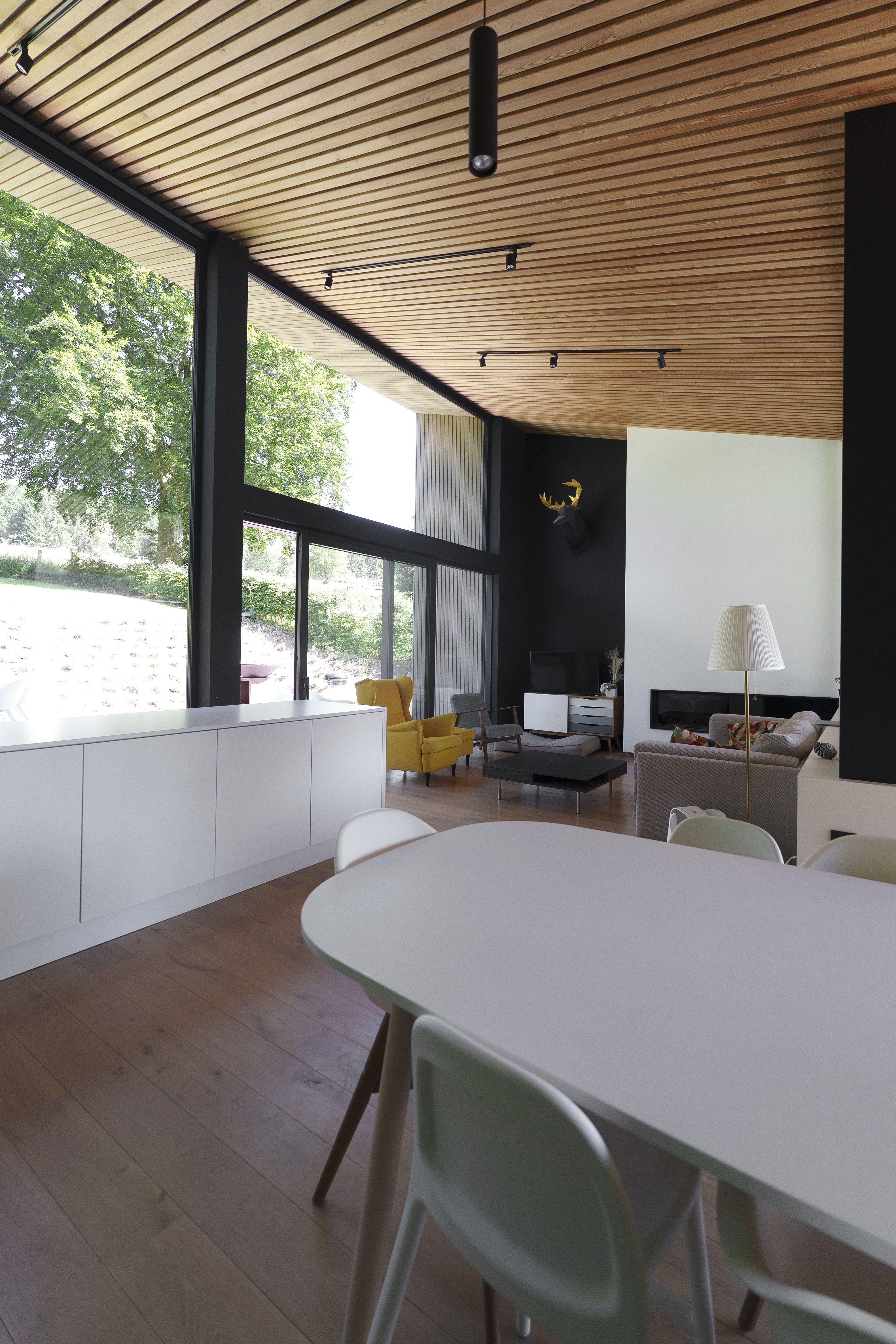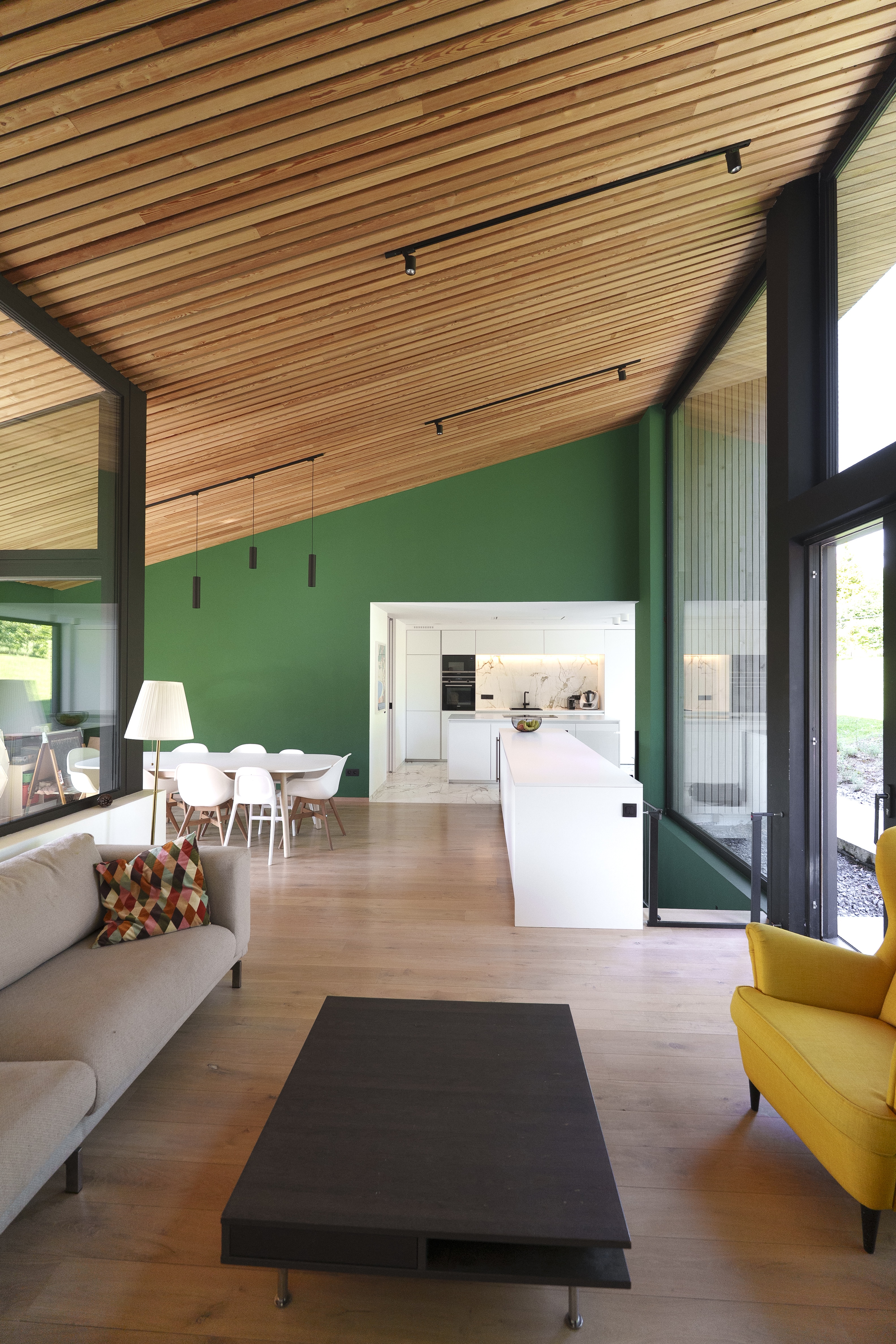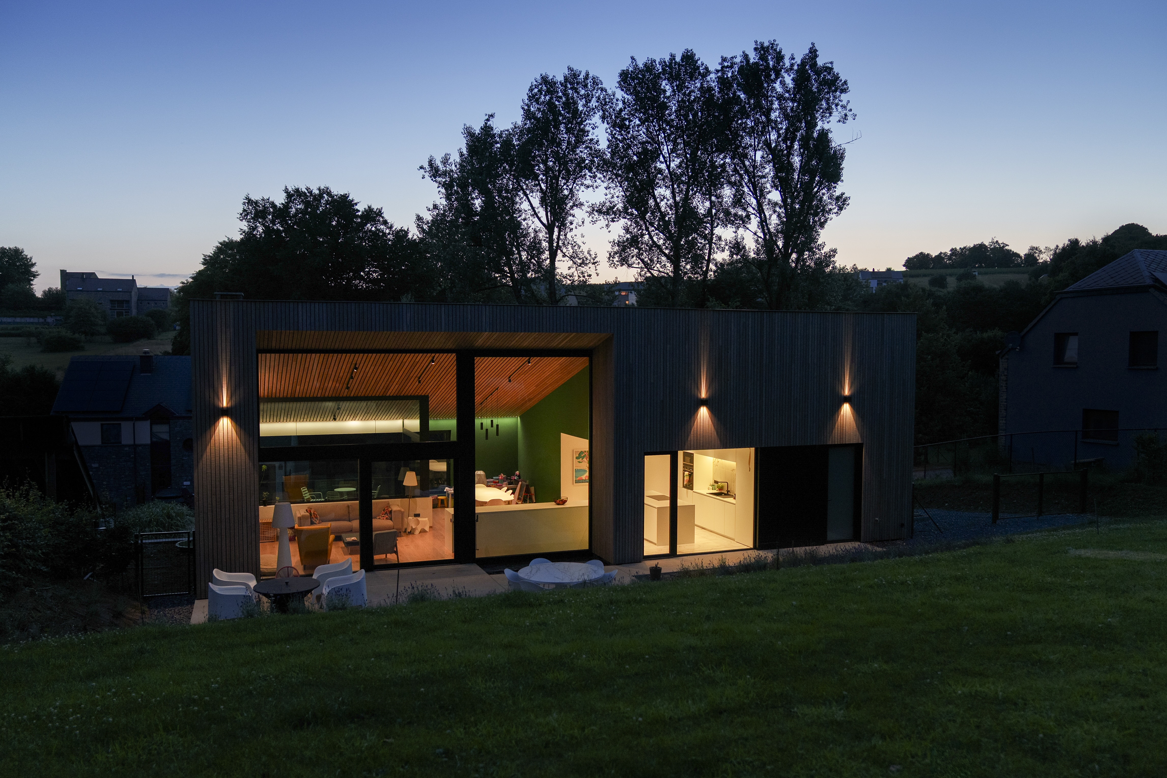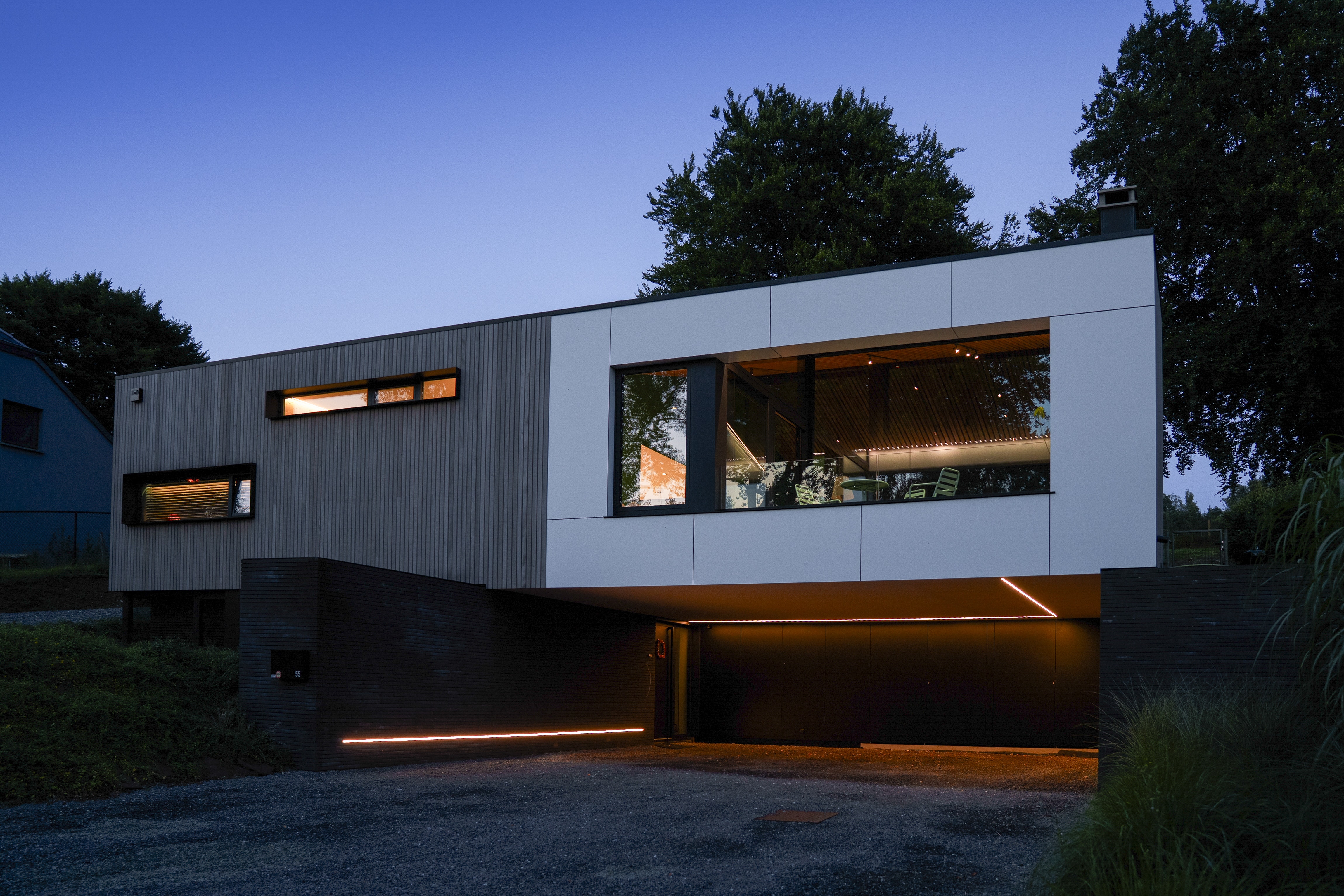 Afin de travailler avec le terrain existant et les contraintes urbanistiques en terme de déblais/remblais, l’habitation est travaillée afin d’avoir l’entrée de plain pied avec le domaine public, et les pièces de vie situées un niveau plus haut, orientées principalement sur l’arrière en contact direct avec la zone de cour et jardin.